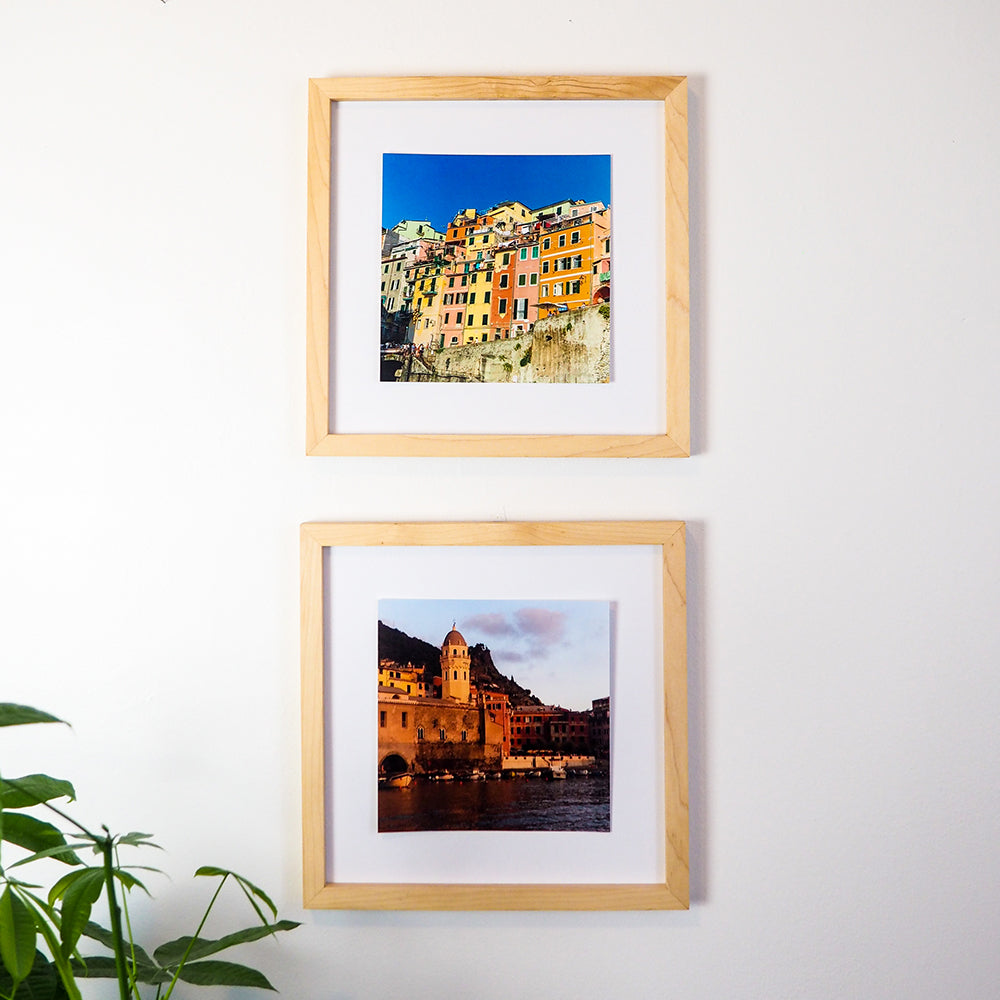 Solid construction sets these frames apart from common retail picture frames. These beautiful maple frames come in 3 standard sizes and 3 color options.