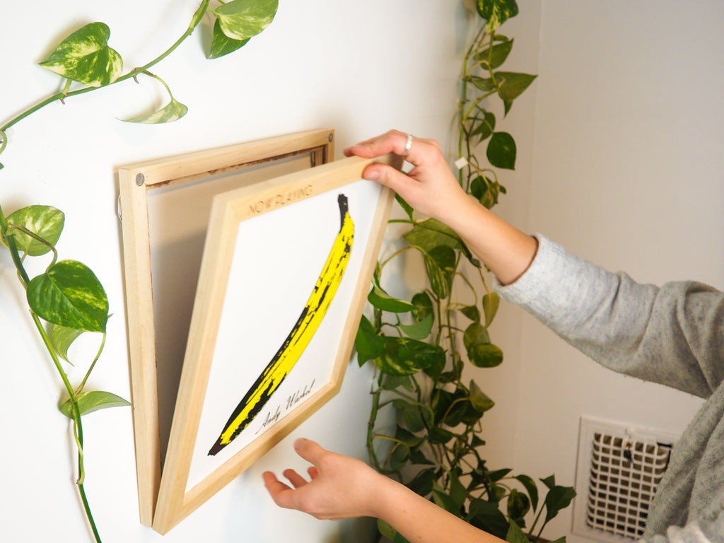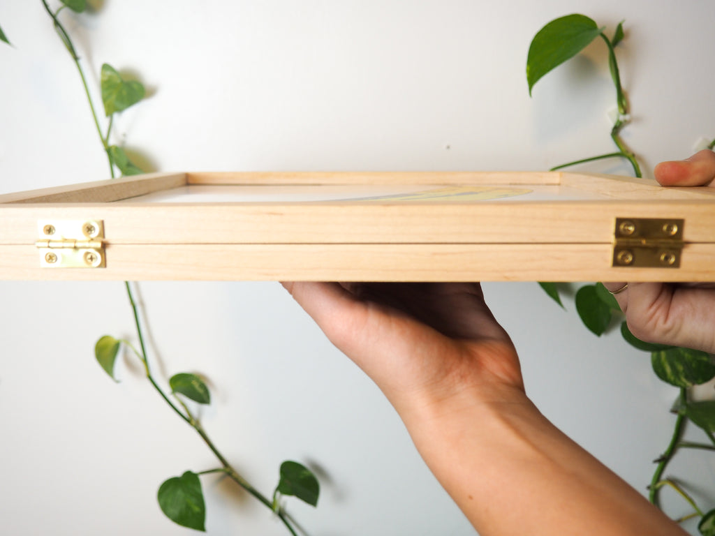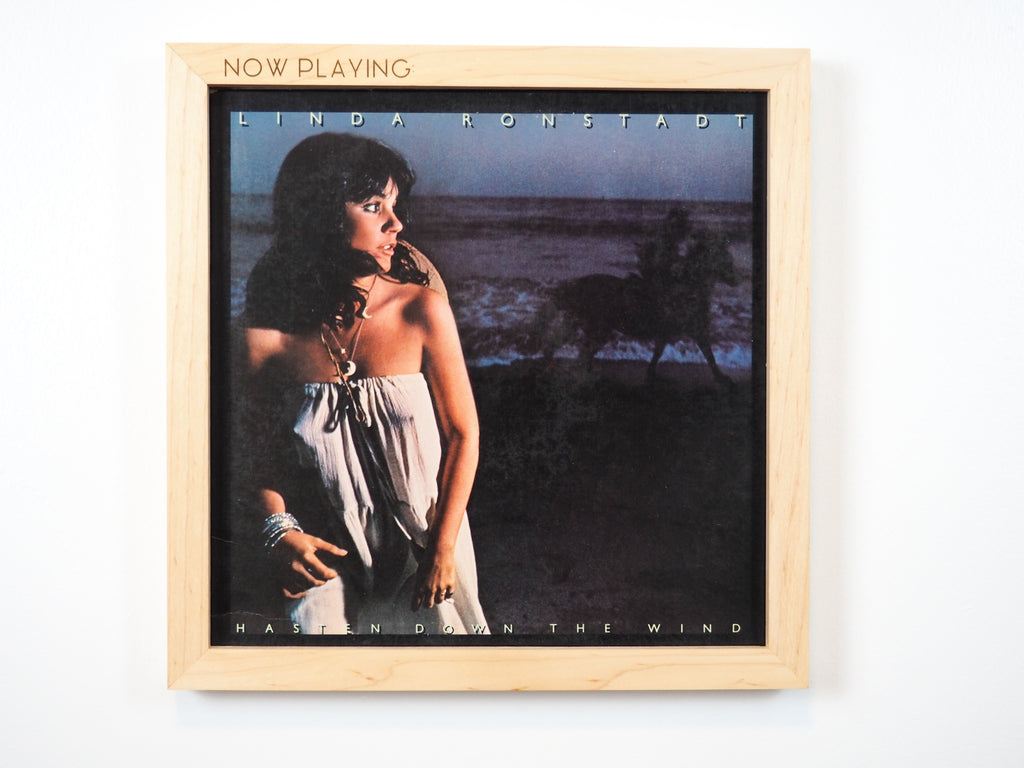 The frame is made out of hard maple wood. Finished with a natural oil/wax mixture. Two D-Rings hold the frame secure to the wall. Metal hinges are attached at the bottom of the frame for easy changing of album covers.