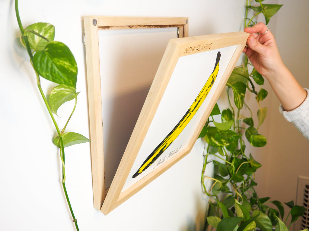 Show off your music in style. Your favorite record, or the one you are currently playing, can be displayed on the wall as the record spins. Allowing this hardwood, handcrafted custom frame to always hold new and changing artwork.