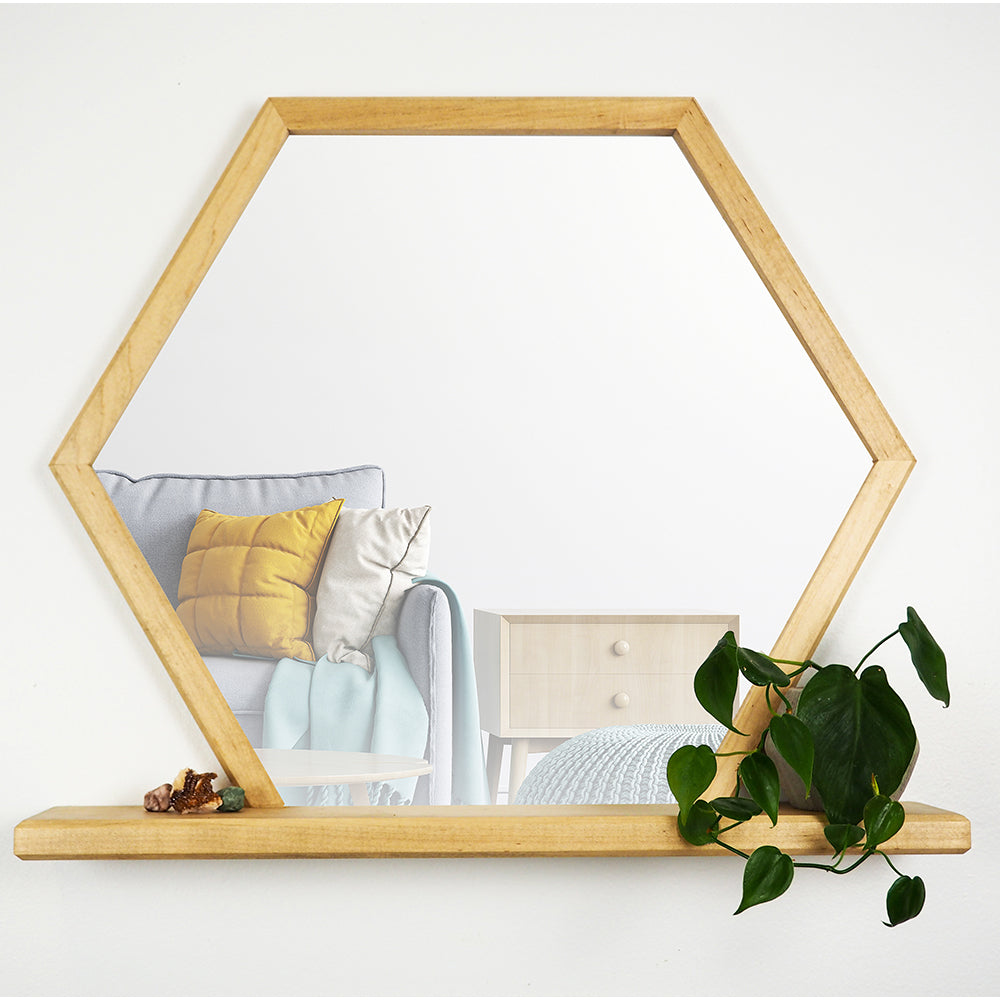 Hexagon Mirror with Wooden Floating Shelf