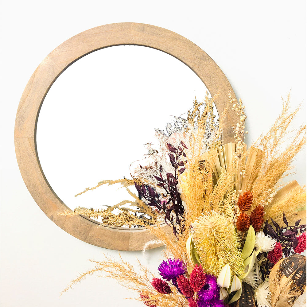 Our round mirror can elevate a mood in your bathroom or living room. The handmade details allow this mirror to go above and beyond big box store purchases.