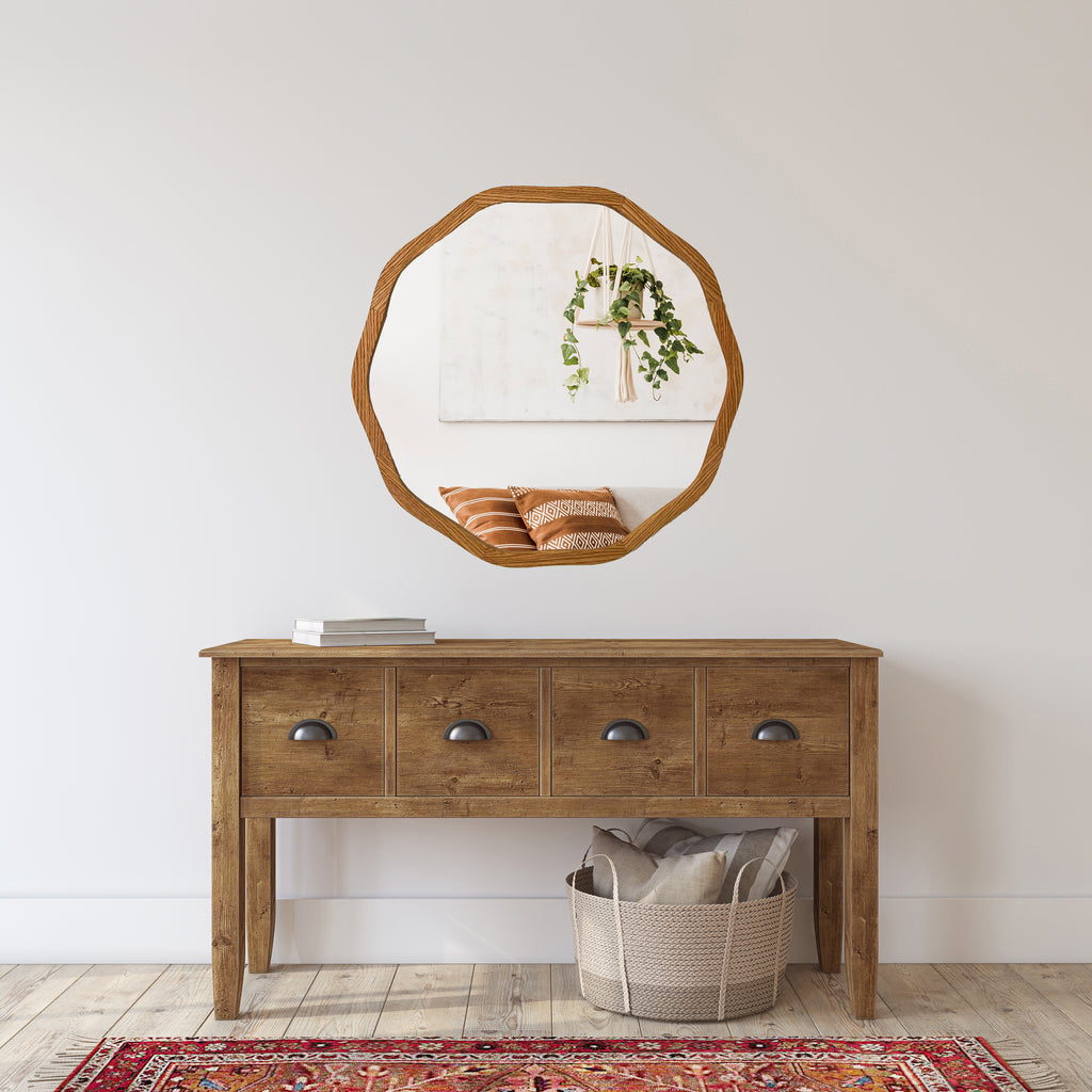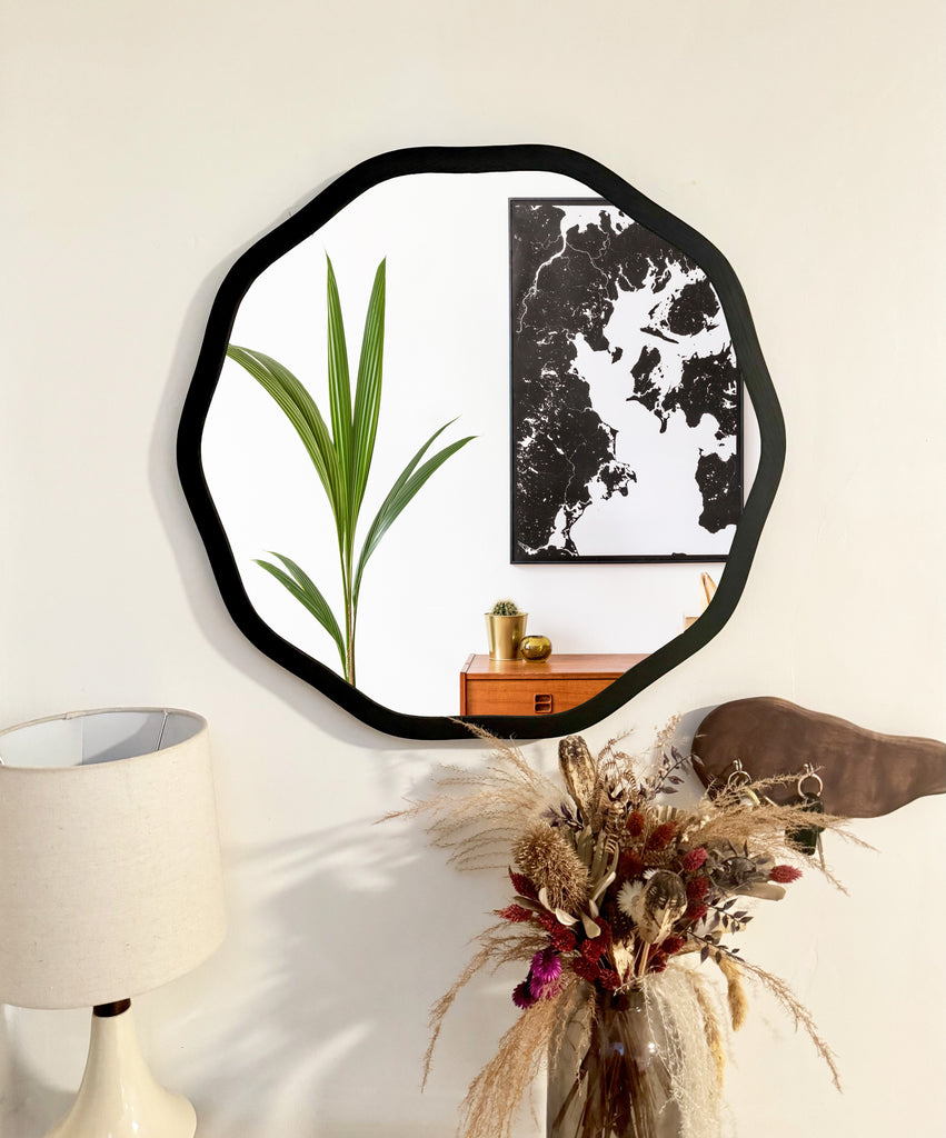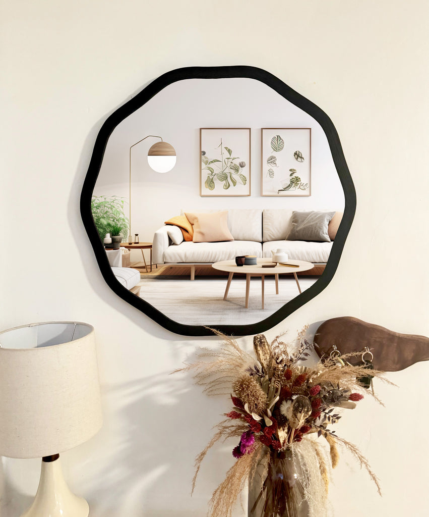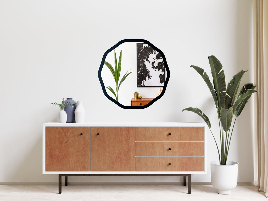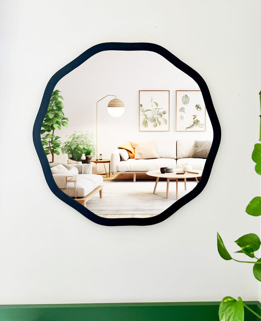 This circle frame mirror is our newest item in our irregular funky mirror collection. This is a decagon frame with rounded, wavy edges to give it a modern edge.